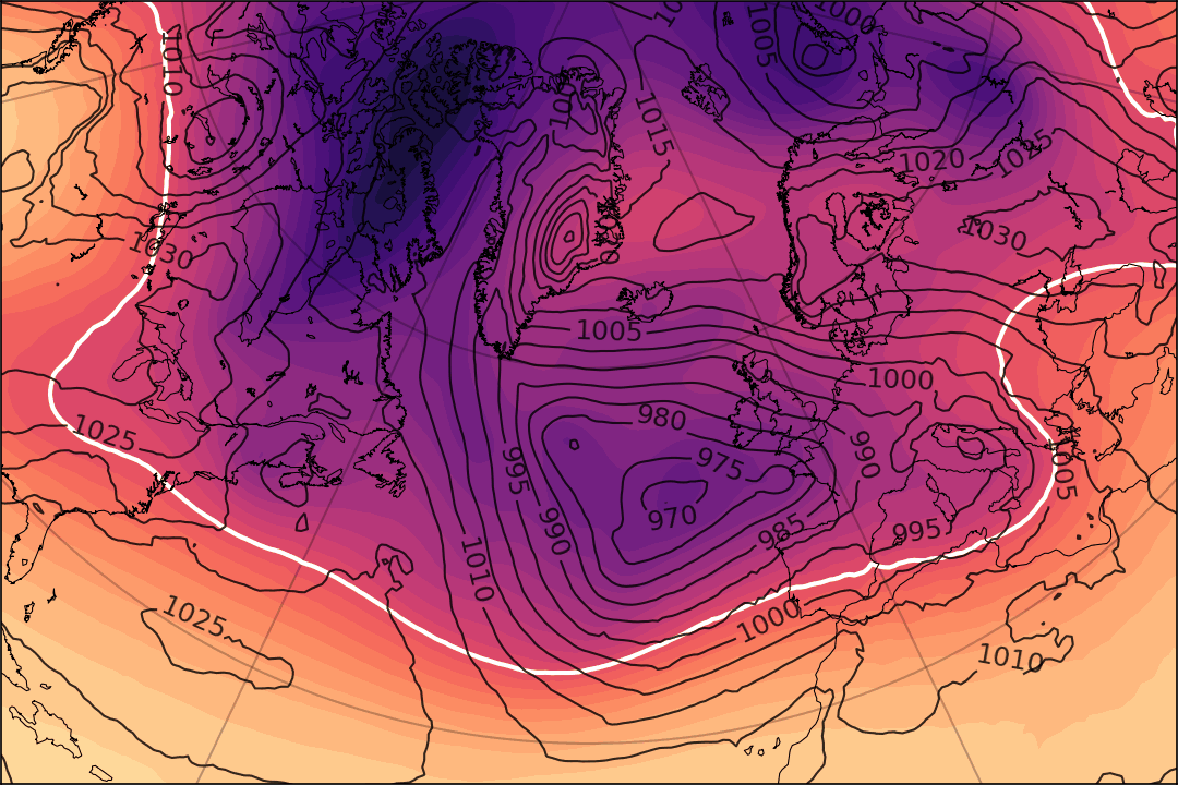 - Sea-level pressure [hPa] (black), contour interval = 5 hPa